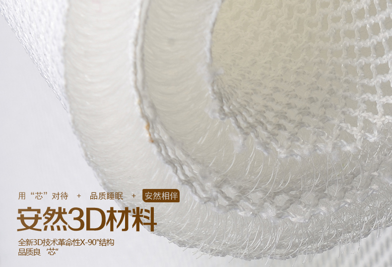 3D床垫以3D材料内胆填充,材料中的软丝是涤纶纤维,和我们身上穿的衣服一样环保安全。外面包裹着安然特有的透气面料,不会掉毛和起球。