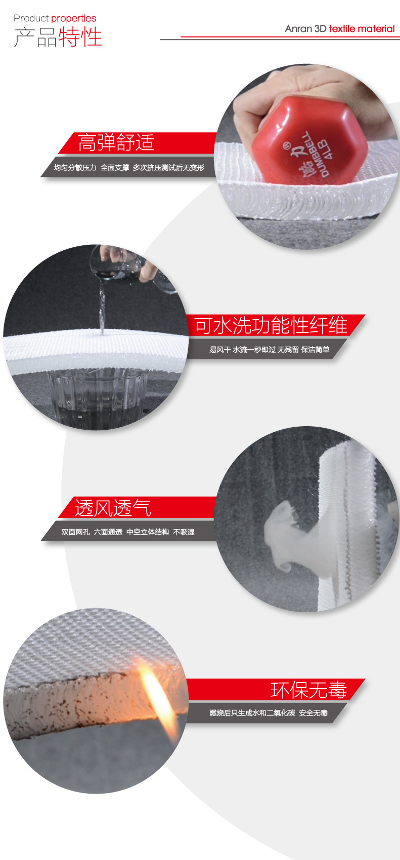 3D材料之所以被福建安然纺织科技如此投入到各种床品的生产中,除了与其它材料一样有着良好的回弹性与支撑性,还因其无可比拟的特点——六面中空立体结构,透气透水,不吸湿自然就不容易发霉,脏了还可以拆开洗,很方便。